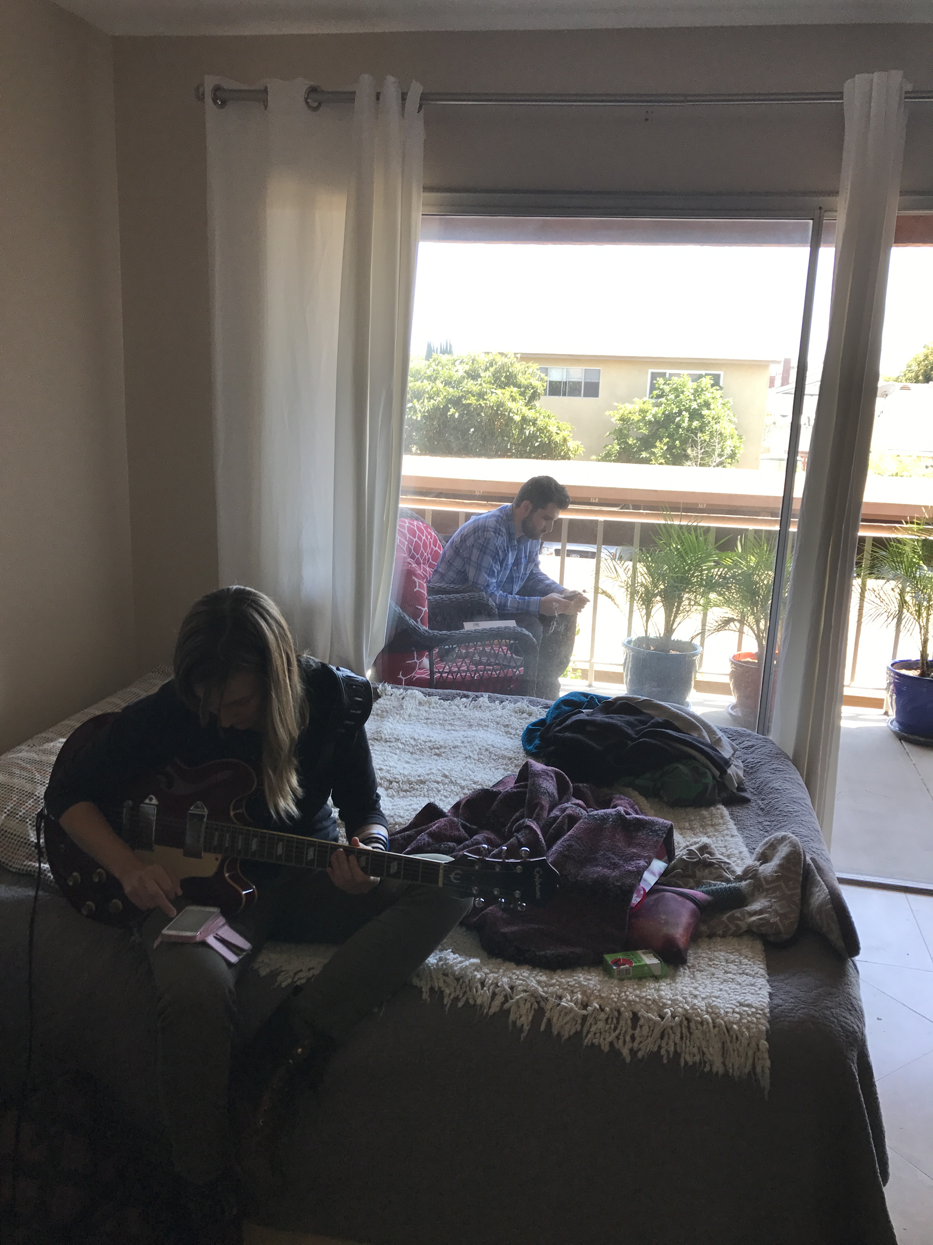 IMG_0064 Published May 15, 2019 at 3024 × 4032 in Are you there blog? It’s me Margaret… My friend Hannah stayed with me and we both performed at the Tongue & Groove reading series at the Hotel Cafe. This is her warming up on my air mattress. Josh is in the background carving on our balcony.